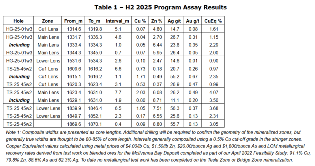 • High-grade copper results from hole TS-25-45w2 confirm continued downdip expansion potential of the Tesla main lens. Hole TS-25-45w2 intersected three lenses of the Tesla mineralization, including a high-grade copper interval from the main lens massive sulphide unit. This intersection marks the farthest downdip intercept of the main lens drilled to date, indicating that the Tesla mineralizing system is still going strong at depth for potential further expansion. The results from TS-25-45w2 are highlighted by: