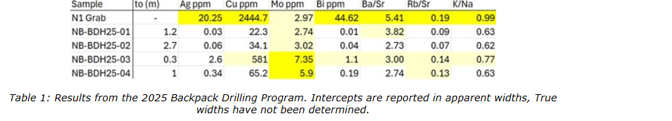 The target is outlined by greater than 700 soil samples over a kilometre-scale alteration zone. All test 2025 samples, including drill core collected approximately 80 metres northeast of the N1 showing, returned elevated molybdenum (2.2 to 7.4 parts per million). One mineralized grab sample contained 0.24 per cent Cu (copper) with elevated Ag-Bi-Te (silver-bismuth-tellurium). Backpack drill samples were analyzed using whole rock geochemistry to test for porphyry alteration indicator ratios (see Table 1). A VLF survey conducted over the N1 showing detected a response interpreted as a strong conductor approximately 20 to 40 metres below the surface.