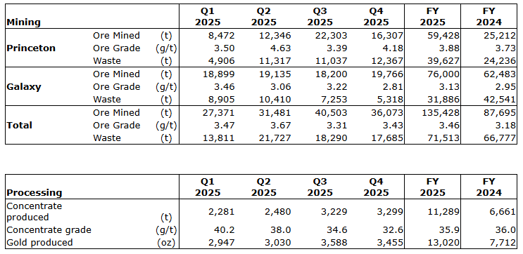 Mined 135,428 tonnes of ore from its Galaxy and Princeton orebodies, with an average grade of 3.46 grams per tonne in FY 2025 compared with 87,695 tonnes at 3.18 g/t in FY 2024, an increase of 54 per cent in ore tonnes mined year over year at a 9 per cent higher grade;