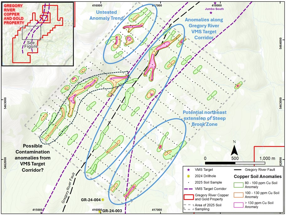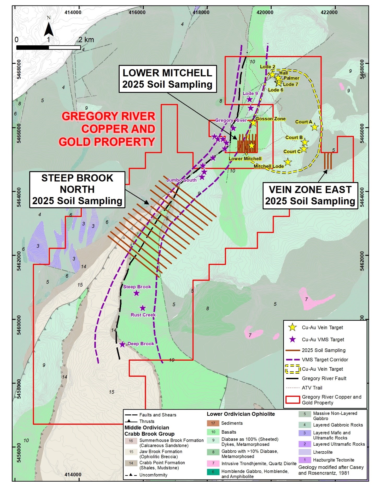 During August 2025, the Company completed a grid of soil samples over the Steep Brook North target area, which is a high-priority, underexplored segment of the Gregory River VMS-Target Corridor that occurs between the Steep Brook target to the south and the Jumbo South Prospect to the north (Figure 1). Significant portions of the area are covered by overburden with limited amounts of outcrop exposure, making soil sampling a good first pass exploration tool to evaluate this area. Soil samples were collected over a northeast oriented grid, covering an area of approximately 2.6 km by 2.0 km. A total of 623 soil samples (plus 28 duplicates samples) were collected over the grid on 200 m spaced lines with 50 m sample spacing along each line. Additional infill lines were sampled along the west portion of the grid. Soil samples were collected using the same sampling procedures as described for Lower Mitchell.