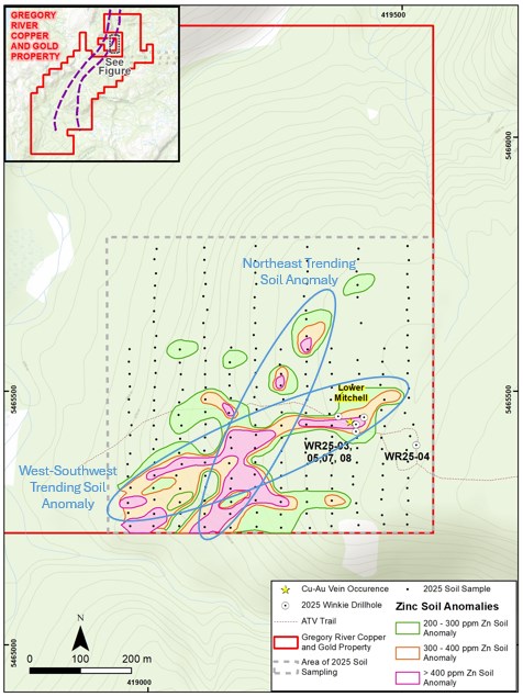 Along the southeastern side of the grid an anomaly trend shows partially coincident, 50 to 100-metre wide, copper, gold, and zinc soil anomalies, which can be intermittently traced approximately 1,200 m along a northeast trend. This trend potentially represents the northeast continuation of the Steep Brook Zone, which was tested with 5 wide-spaced diamond drill holes during late 2024, resulting in numerous anomalous copper and gold intervals (refer to Press Release "Golden Spike Announces Gregory River Drilling Results" dated February 13, 2025). This included drill hole GR-24-003, located about 500 m southeast from the southern tip of the copper and gold soil anomaly (Figures 4 and 5, respectively), which returned 1.29% copper, 0.19 g/t gold over 1.5 m and 1.37% copper, 0.02 g/t gold over 0.5 m, within a wider 11.15 m interval grading 0.33% copper and 0.04 g/t gold.