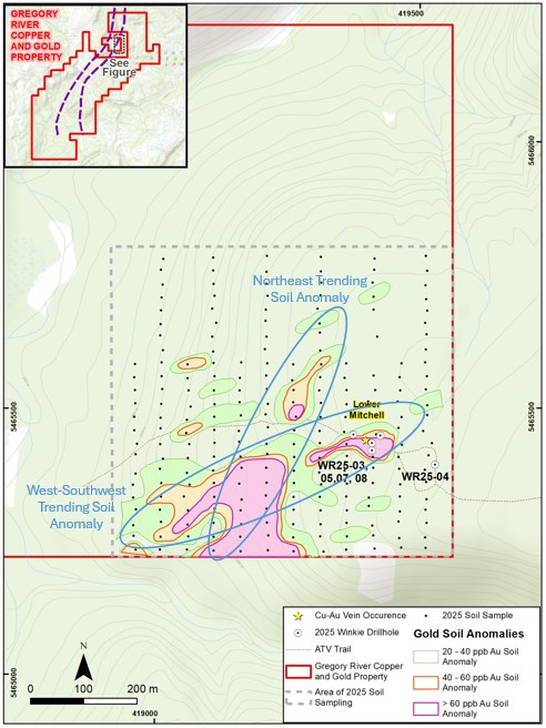 During November 2025, the Company completed a program of soil sampling over the Lower Mitchell target to follow-up on highly anomalous drillhole results from a Winkie drilling program in July 2025. The soil survey covered an area of approximately 550 m east-west by 560 m north-south and included 225 soil samples (plus 4 duplicate samples) collected along twelve, north-oriented lines. Lines were spaced 50 m apart, with samples collected every 25 m along each line. Line lengths alternated between 350 m and 560 m (Figure 1).