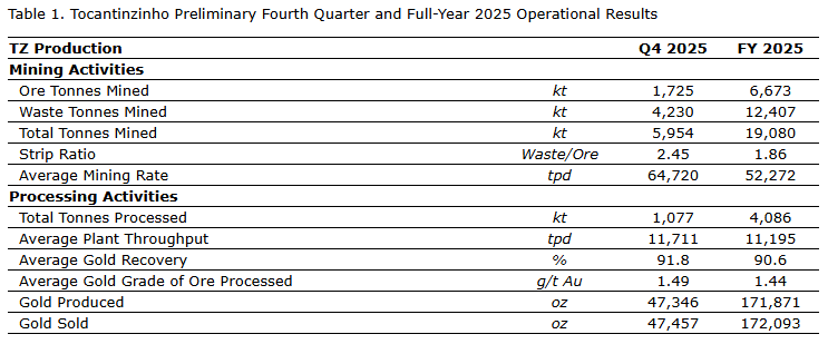 G Mining Ventures Corp. has provided its preliminary production results for the fourth quarter and full year ended Dec. 31, 2025, for the Tocantinzinho gold mine (TZ), located in the state of Para, Brazil.