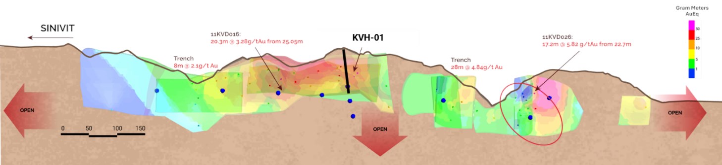 Figure 2: Kavasuki target long-section looking west with location of KVH-01 highlighted and g/t-m contour intervals from historical shallow drilling.
