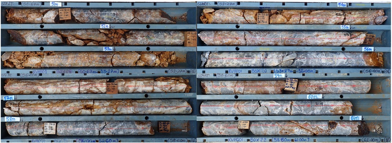 - First hole KVH001 has reached ~100m depth (Figure 2), intersecting a breccia-dominant, silica-flooded vein system characterized by multi-phase quartz veining, strong brittle fracturing and zones of well-developed sulphide mineralization including pyrite and chalcopyrite. Geological features are consistent with a robust, structurally controlled hydrothermal system.