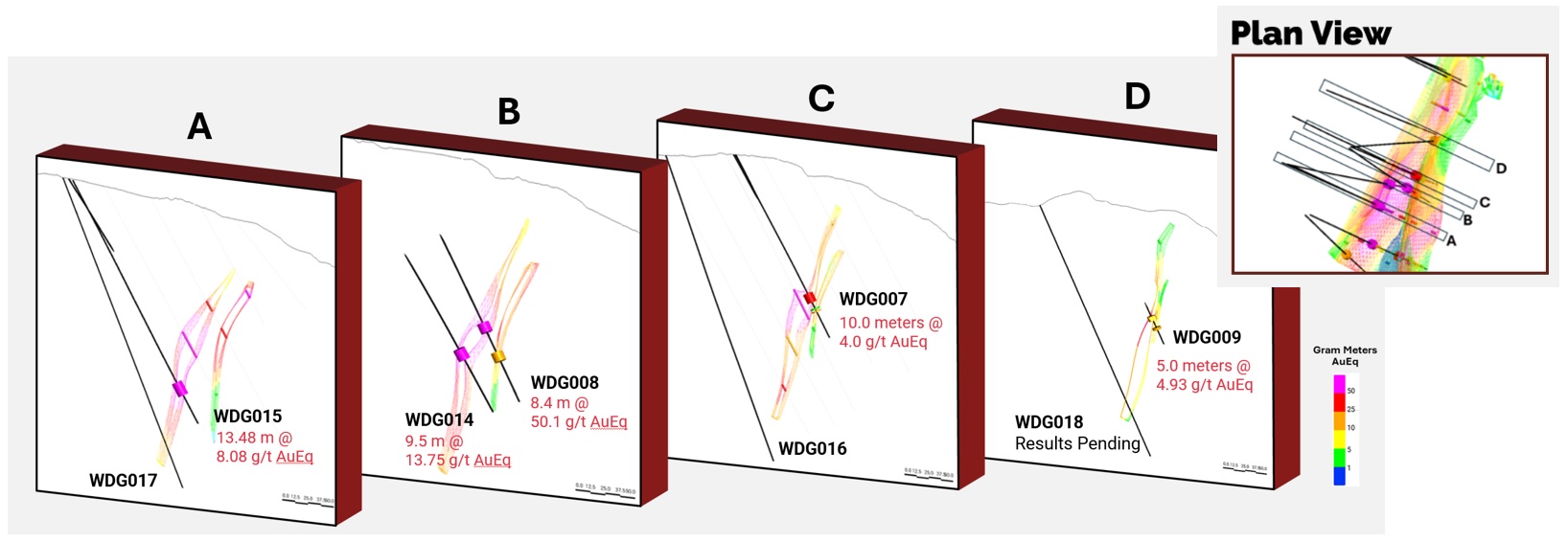 - WDG 15: 13.5m @ 8.08 g/t AuEq from 210.22 m (7.41 g/t Au, 0.31% Cu, 16.37 g/t Ag);