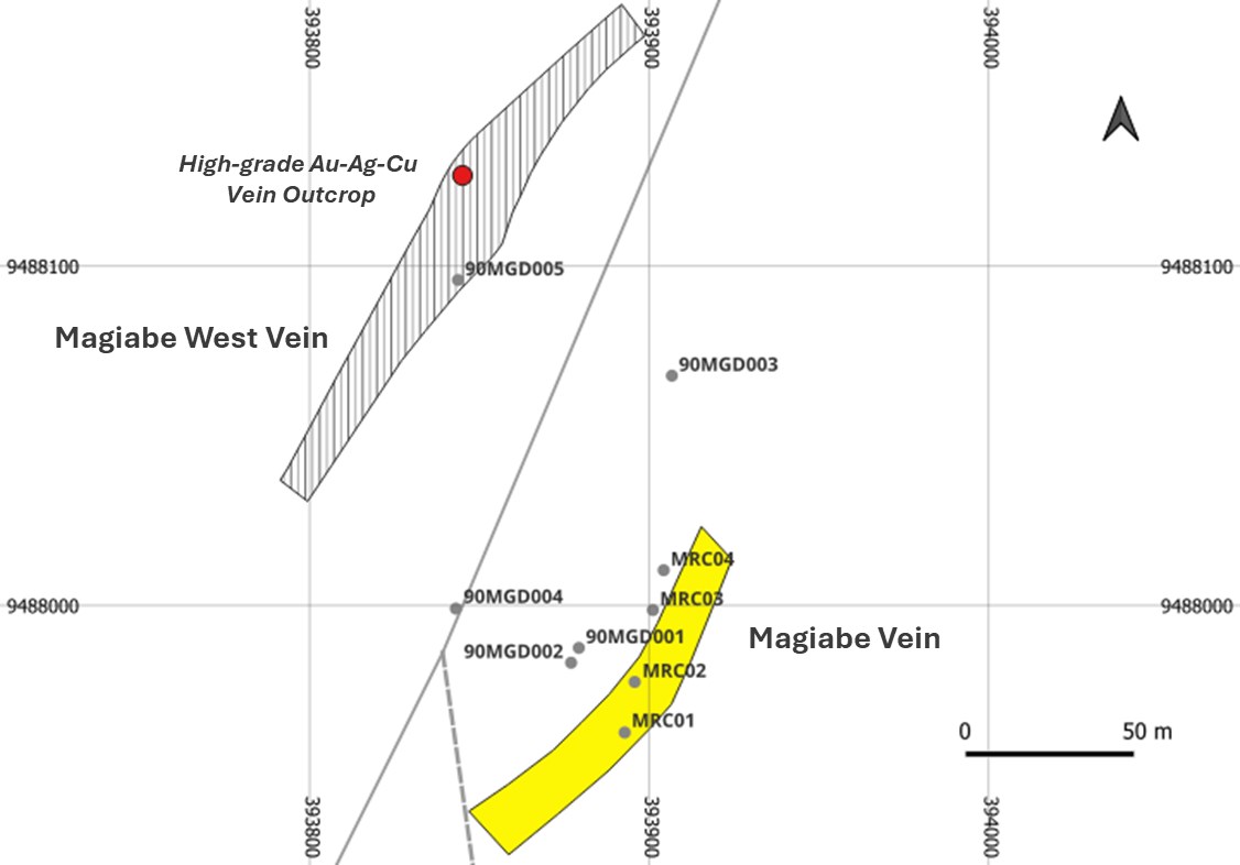Recent rock-chip sampling within the Magiabe prospect area has returned exceptionally high-grade results (Table 2) and led to the identification of the Magiabe West Vein, located approximately 100 metres west of the main Magiabe Vein (Figure 2).