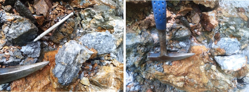 Photo 1: Sampled outcrop at the Magiabe West Vein high-grade location, showing brecciated quartz-sulphide mineralization within a silicified host. Visible sulphides occur along fracture surfaces and within the quartz matrix, consistent with a structurally controlled epithermal Au-Ag-Cu vein system. A geological hammer and pen provide scale.