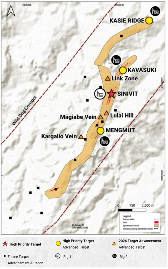 A second drill rig has arrived on site and will shortly commence drilling at Kasie Ridge, a 1.5-2.0 km long advanced argillic lithocap target interpreted as a potential high-sulphidation epithermal system at the northern end of the corridor. With two rigs active and drilling distributed along the corridor, the Company is systematically testing the full strike extent of the Wild Dog Structural Corridor.