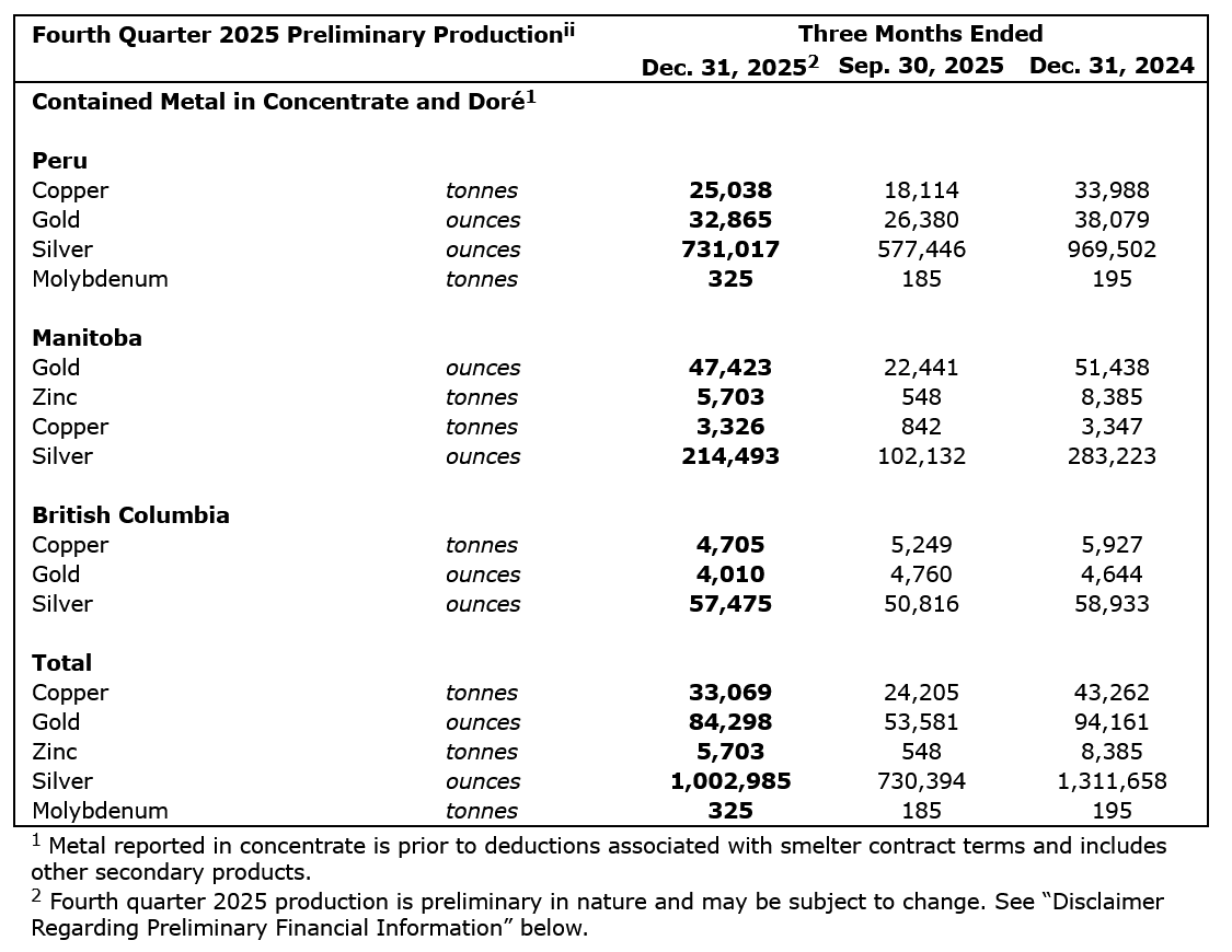 Hudbay Minerals Inc. has released preliminary production results for the three months and year ended Dec. 31, 2025. All amounts are in U.S. dollars, unless otherwise noted.