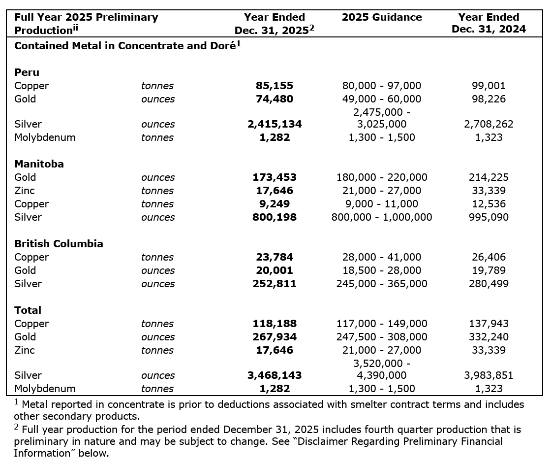 "We are proud to have achieved full-year production guidance for our two primary metals, copper and gold, after overcoming several temporary operational interruptions in 2025, which demonstrates the resilience and strength of our diversified operating platform," said Peter Kukielski, Hudbay's president and chief executive officer. "Our operations delivered steady production performance in the fourth quarter and maintained a rigorous focus on operational efficiencies and stabilization, resulting in a strong finish to the year. Notably, we achieved a standout fourth quarter in Peru with the efficient mining of the high-grade Pampacancha satellite deposit, allowing us to far exceed the top end of the 2025 gold production guidance range in Peru."