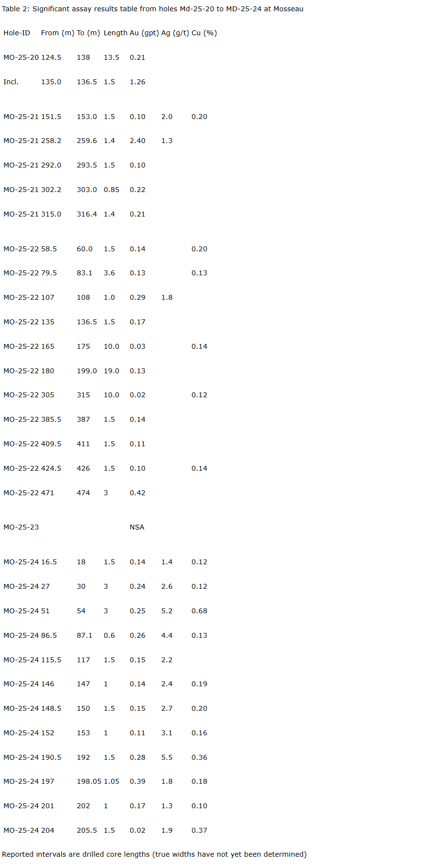 Highest grade assays from the second batch of five drill holes include 2.40 grams per tonne Au over 1.4 m (MO-25-21) and 1.26 g/t Au over 1.5 m (MO-25-20).