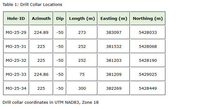Harvest Gold would also like to report the results from the final five holes completed in its 2025 drill program (Table 1). The drill holes targeted gold in soil anomalies associated with magnetic highs to the north of the Kiask River deformation zone, in the central part of the Mosseau property. The most significant results from these five drill holes included anomalous copper intersections of 464 parts per million Cu over 3.0 m (SW-25-29) and 802 ppm Cu over 0.9 m (SW-25-34). These anomalous Cu intersections are considered significant in that it reinforces copper as a key pathfinder for gold mineralization on the Mosseau property. Both these intersections are from a northern, previously untested horizon parallel to the Kiask River deformation zone and proximal to an untested gold in soil anomaly. This horizon is interpreted to represent a possible extension of the Morono deposit horizon, based on its proximity to the Wilson intrusion.