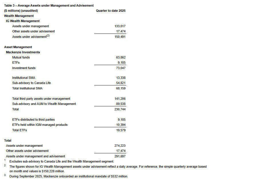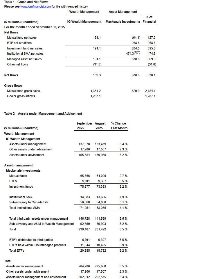 IGM FINANCIAL INC. ANNOUNCES SEPTEMBER 2025 ASSETS UNDER MANAGEMENT & ADVISEMENT AND NET FLOWS
