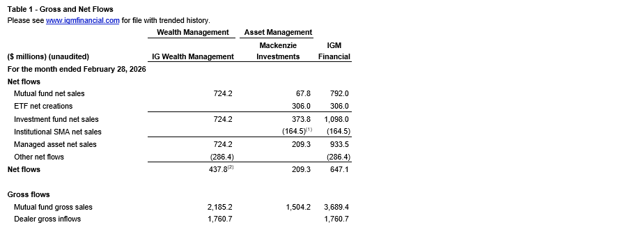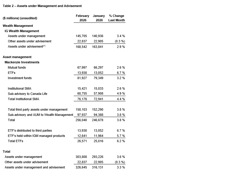 IGM FINANCIAL INC. ANNOUNCES FEBRUARY 2026 ASSETS UNDER MANAGEMENT & ADVISEMENT AND NET FLOWS