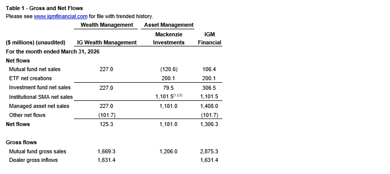 IGM FINANCIAL INC. ANNOUNCES MARCH 2026 ASSETS UNDER MANAGEMENT & ADVISEMENT AND NET FLOWS