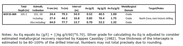 - WSF25-06R: 54.9 metres (24.4 to 79.3 m) grading 1.00 gram per tonne gold equivalent, including 16.8 metres (27.4 to 44.2 m) grading 1.75 g/t AuEq -- a shallow, thick, intercept of oxide gold mineralization confirming gold and silver mineralization reported in historic drill holes: