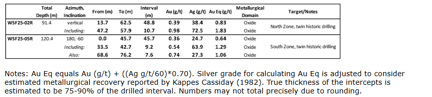 • WSF25-02R: 48.8 metres (13.7 to 62.5 m) grading 0.83 gram per tonne AuEq including 10.7 metres (47.2 to 57.9 m) grading 1.83 g/t AuEq, a very shallow intercept of oxide gold and silver mineralization that shows excellent continuity with adjacent Lahontan drilling and historic drilling.