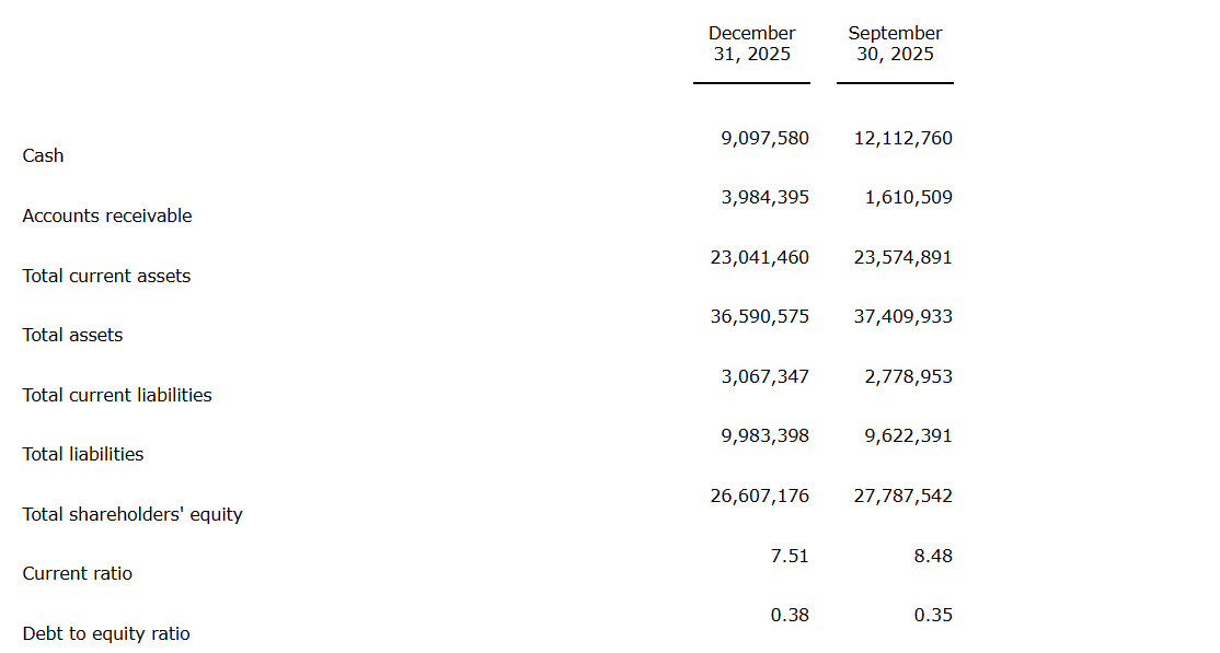 Over all, weaker Q1 revenues and decreased margins led to an operating and net loss of $1,167,177 versus a Q1 2025 operating and net income of $856,962. Cash used in operating activities was $2,602,403, compared with cash provided by operating activities of $792,702 in 2025. Much of the cash used in operating activities during the quarter was consumed by increasing accounts receivable, which grew by $2,373,886 since Sept. 30, 2025, and stood at $3,984,395 as at Dec. 31, 2025. At the end of Q1, Microbix's current ratio (current assets divided by current liabilities) was 7.51 and its debt-to-equity ratio (total debt over shareholders' equity) was 0.38.