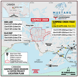 VANCOUVER, British Columbia, April 29, 2026 (GLOBE NEWSWIRE) -- Mustang Energy Corp. (CSE: MEC, OTC:MECPF, FRA:92T) (the “Company” or “Mustang”) is pleased to announce it has received assay results from all 11 diamond drill holes on the Surprise Creek Uranium-Copper (“Surprise Creek” or the “Project”), located in a prospective region known for its mineral potential northwest of the Athabasca Basin. The Company entered into an option agreement (the “Option Agreement”) with Thunderbird Resources Ltd. (“Thunderbird”) to acquire an undivided 80% interest in the Project. Please refer to the Company’s news release dated June 4, 2025, and June 16, 2025, as filed under the Company’s SEDAR+ profile, for further details regarding the Option Agreement.