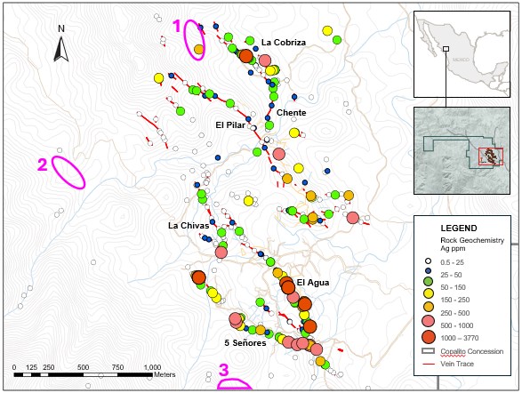 The third discovery is located approximately 500 m southwest of the 5 Señores vein, in an area with no previously documented mineralization. The discovery outcrop occurs as silicification and quartz stockwork found in andesite, which hosts galena sulphides and potentially silver-bearing sulphosalts. This area is intriguing as it is potentially located outside of the Copalito Graben, within which all previous known mineralization has been discovered.