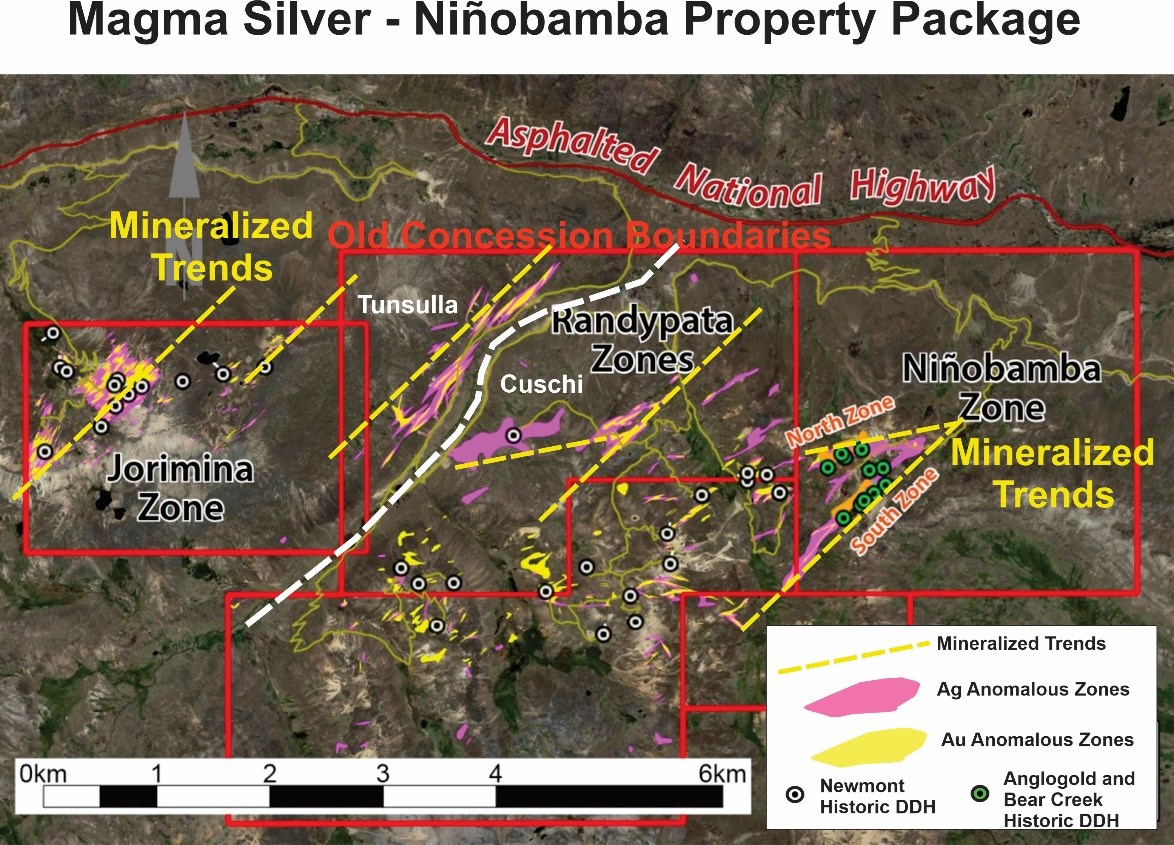 Magma Silver Corp. is a natural resources exploration company focused on acquiring, exploring, developing, and operating precious metal mining projects. Listed on the TSV Venture Exchange ("MGMA"), OTCQB ("MAGMF"), and Frankfurt Exchange ("BC21"), the Company's primary focus is on exploring and developing the advanced Niñobamba silver-gold project in the mining-friendly country of Peru. Niñobamba spans an 8 km mineralized corridor in a prolific geological belt of a high-sulphidation epithermal system. Extensive exploration by Newmont Corporation, AngloGold Ashanti Limited, Bear Creek Mining Corporation and Rio Silver, has demonstrated significant resource potential with over C$14.5 million invested to date. Magma is advancing its Niñobamba project using modern geological modelling and a strategic development plan. The property has excellent infrastructure, strong relationships with local communities and a regional technical team with over 50 years of mining experience in Peru.