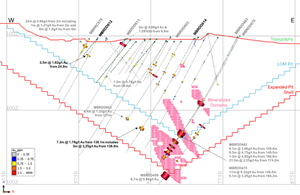 Figure 2. Long section A-A through Buffalo Reef Central depicting Mine Expansion target Areas (Stage 1 and Stage 2) targeted in the Mine Expansion Drilling, looking west.