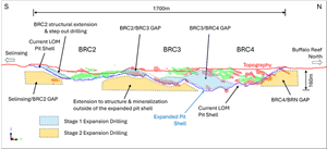 Long section A-A through Buffalo Reef Central depicting Mine Expansion target Areas (Stage 1 and Stage 2) targeted in the Mine Expansion Drilling, looking west