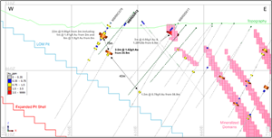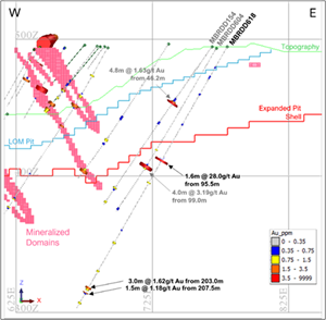Cross-section through Buffalo Reef Central Pit 3 at 4020mN looking north (40m wide window north and south) and depicting historic drilling and recently completed MBRDD618 in relation to existing drilling and mineralized domains