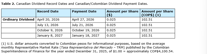 The board is elected in accordance with the Colombian electoral quotient system, under which directors are elected based on slates of nominees proposed for election. For additional information, see the company's management information circular dated Feb. 17, 2026, available on the company's website and under its profile on SEDAR+.