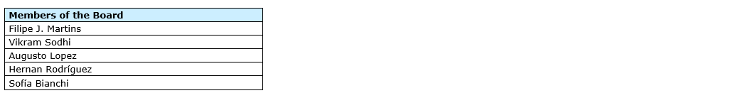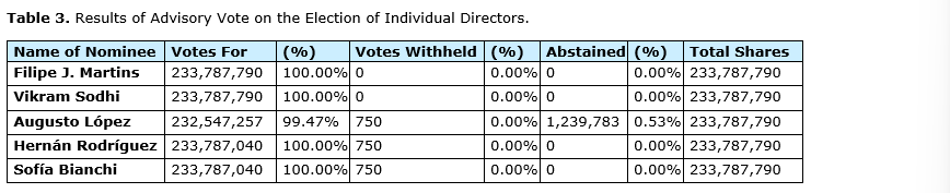 A single slate of five nominees was proposed for election at the meeting. The slate, recommended by the corporate governance and sustainability committee and set forth in the circular, consisted of Filipe J. Martins, Augusto Lopez, Vikram Sodhi, Hernan Rodriguez and Sofia Bianchi.