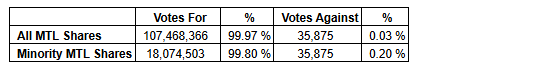 The arrangement resolution required approval by (a) at least two-thirds of the votes cast by MTL shareholders present in person or represented by proxy and entitled to vote at the meeting; and (b) a majority of the votes cast by MTL shareholders present in person or represented by proxy and entitled to vote at the meeting, excluding for this purpose votes attached to MTL shares required to be excluded pursuant to Multilateral Instrument 61-101 -- Protection of Minority Security Holders in Special Transactions. Details on the voting results at the meeting are shown in the attached table.