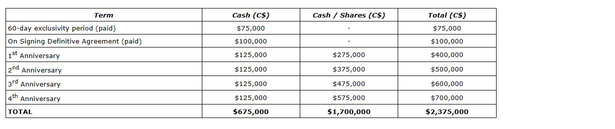 Under the terms of the agreement, Lunex can earn a 100-per-cent interest in the project for total consideration of $2,375,000 payable in cash and Lunex common shares (see news release dated Oct. 6, 2025) as detailed in the attached table.