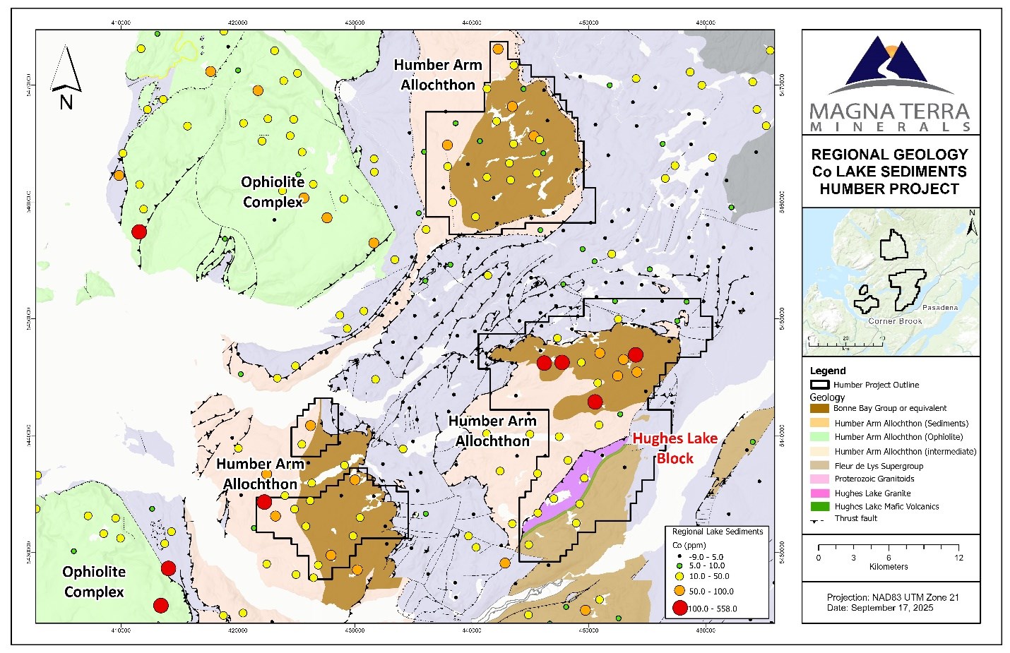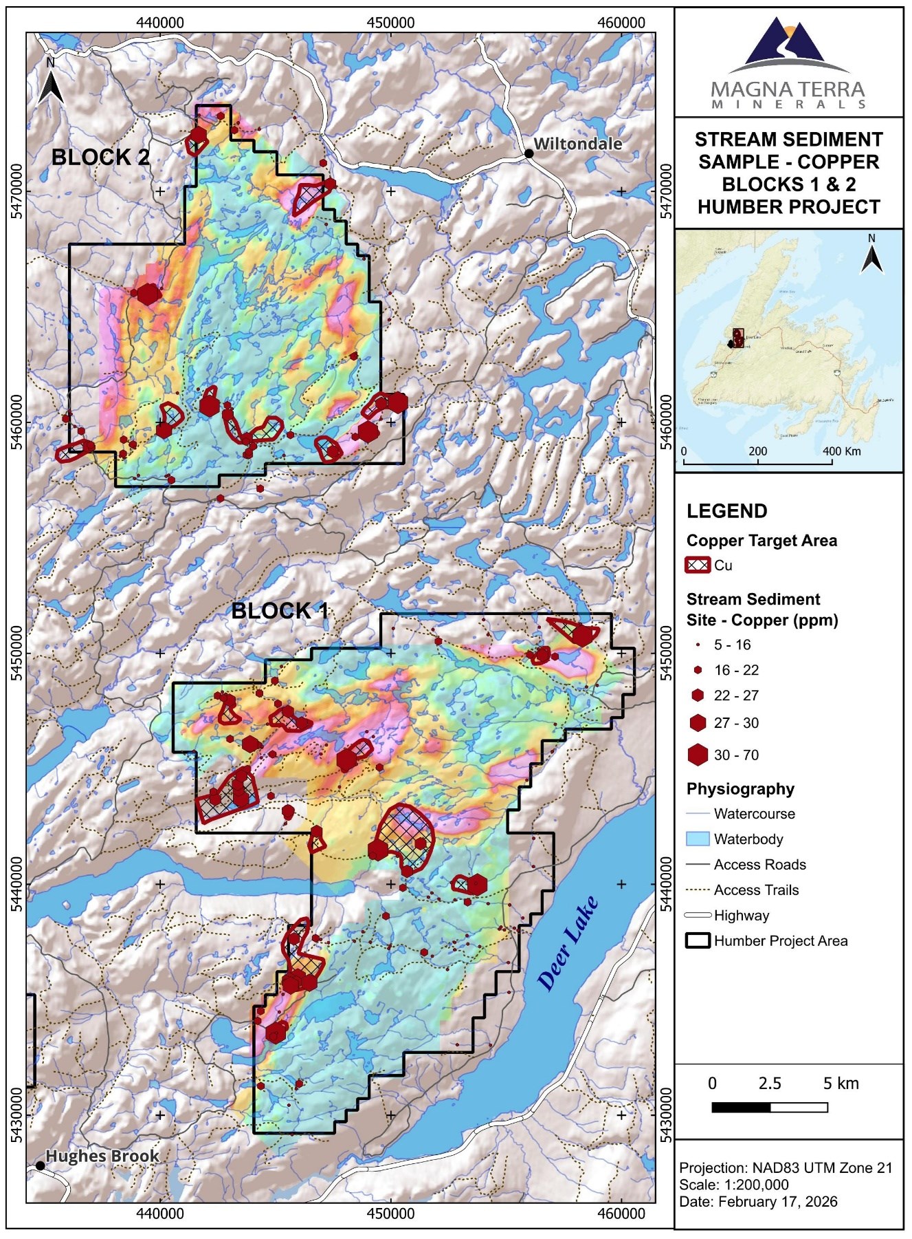 Toronto, Ontario--(Newsfile Corp. - February 19, 2026) - Magna Terra Minerals Inc. (TSXV: MTT) ("Magna Terra" or the "Company") is pleased to announce that it has received analytical results from a regional stream sediment geochemical survey over the 100% owned Humber Copper-Cobalt Project (the "Humber Project" or the "Project") located in western Newfoundland. The stream sediment samples were collected to further assess regional prospectivity for Sediment-hosted Stratiform Copper ("SSC") mineralization and complement the recently completed airborne geophysical survey covering the property (see news release dated September 18, 2025) (Figures 1, 2, 3, and 4).