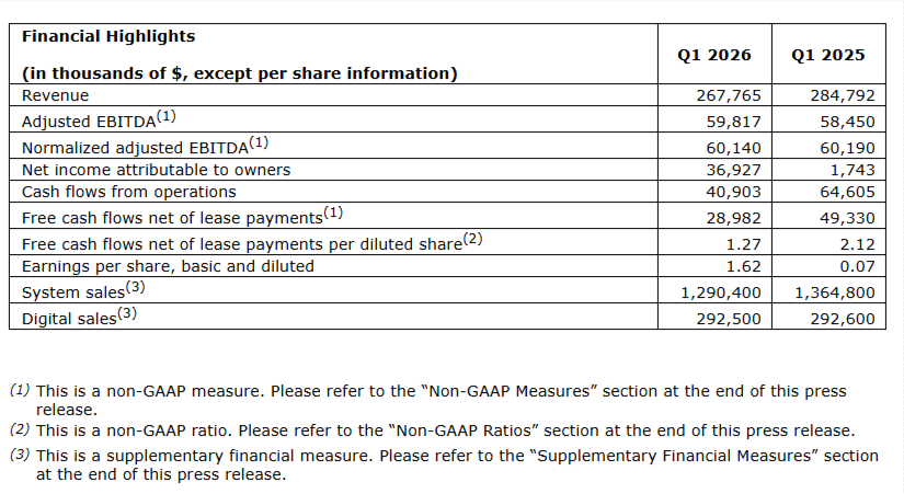 In the first quarter of 2026, cash flows generated by operating activities amounted to $40.9-million compared with $64.6-million in the first quarter of 2025. The change was primarily attributable to lower working capital due to timing of payroll and benefit accruals and lower interest expense accruals, timing of payments made and an increase in royalties and vendor rebates receivables, as well as higher income taxes paid. Excluding the variations in non-cash working capital items, income taxes, interest paid and other, operations generated $59.9-million, compared with $58.6-million last year.