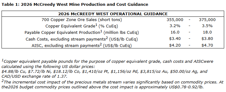 Copper equivalent payable production guidance of 16.0 million to 18.0 million pounds CuEq from the 700 copper zone at McCreedy West mine in 2026;