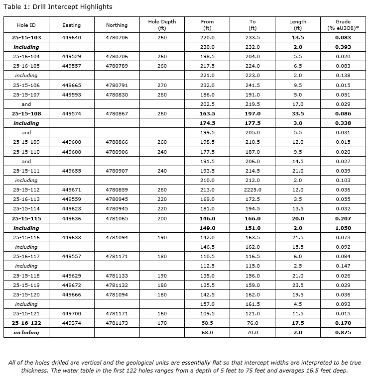 As drilling advances toward the northern end of the company's planned program on the trend, the company continues to intersect consistent uranium mineralization while also recording two intercepts that exceeded the highest grades previously reported in the program. These results not only confirm the strength and continuity of the roll-front system along strike, but also provide strong geological support for the uranium trend to continue onto the company's recently staked northern extension of the property toward the established uranium resources held by Uranium Energy Corp.