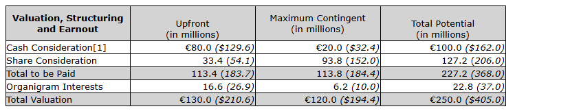 Earnout consideration will be settled with a maximum of 20 million euros cash and the remainder in Organigram shares issued at the 20-day VWAP on the TSX subject to a $3.00 floor and $4.00 cap.