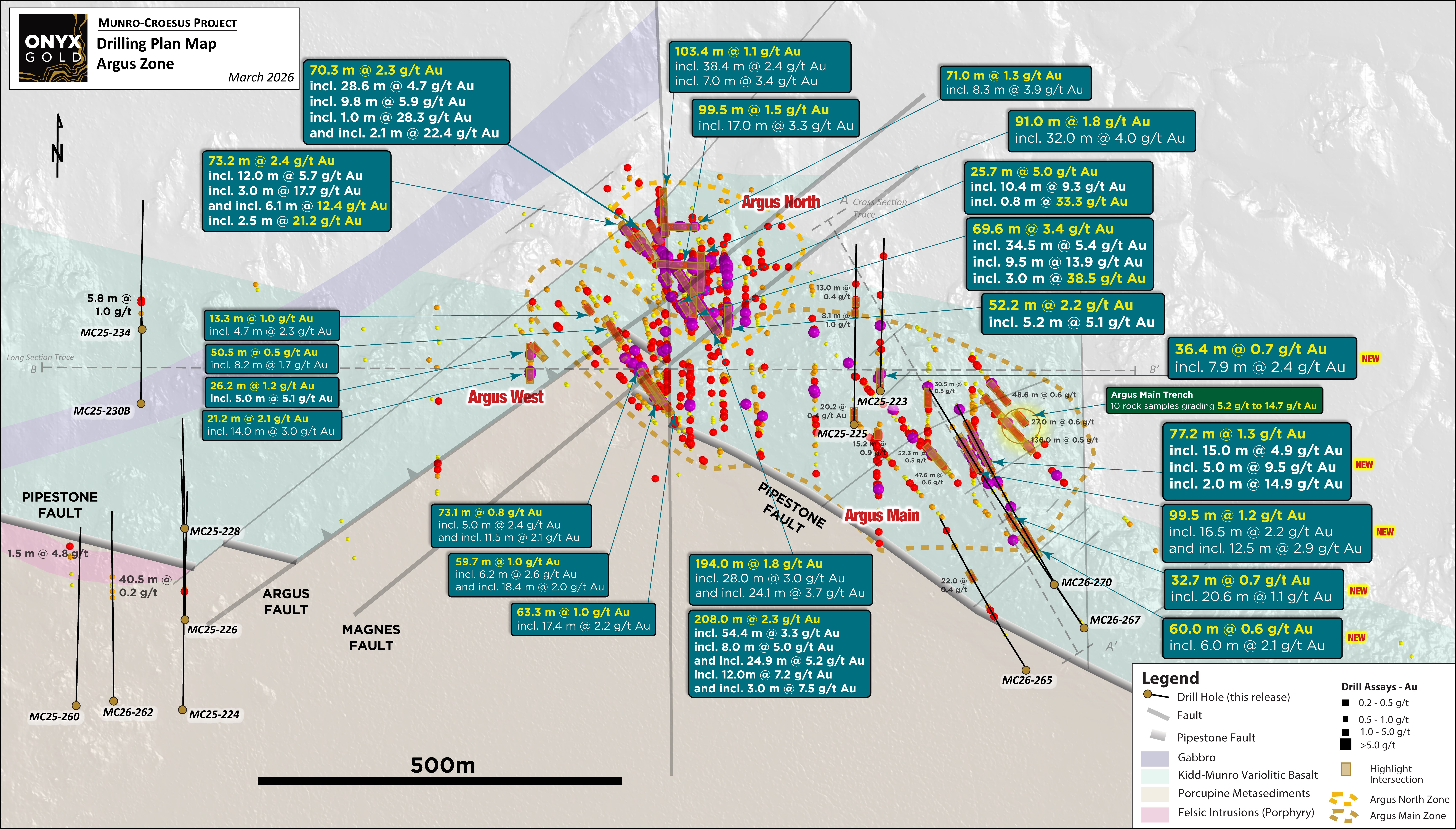 "With this growing confidence, our 2026 strategy is focused on three key priorities: rapidly expanding the Argus zones through systematic step-outs, executing bold regional step-outs along the Pipestone Fault to unlock new discoveries, and advancing multiple high-grade and bulk-tonnage targets within 6 kilometers of the Argus zones. With three rigs currently turning and a fully funded program, we believe we are just beginning to unlock the broader potential of the Munro-Croesus property."