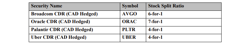 Cboe Canada Inc. has confirmed a proposed stock split for each of the Canadian depositary receipts (CDRs) named in the attached table based on the applicable stock split ratio set out in the table.