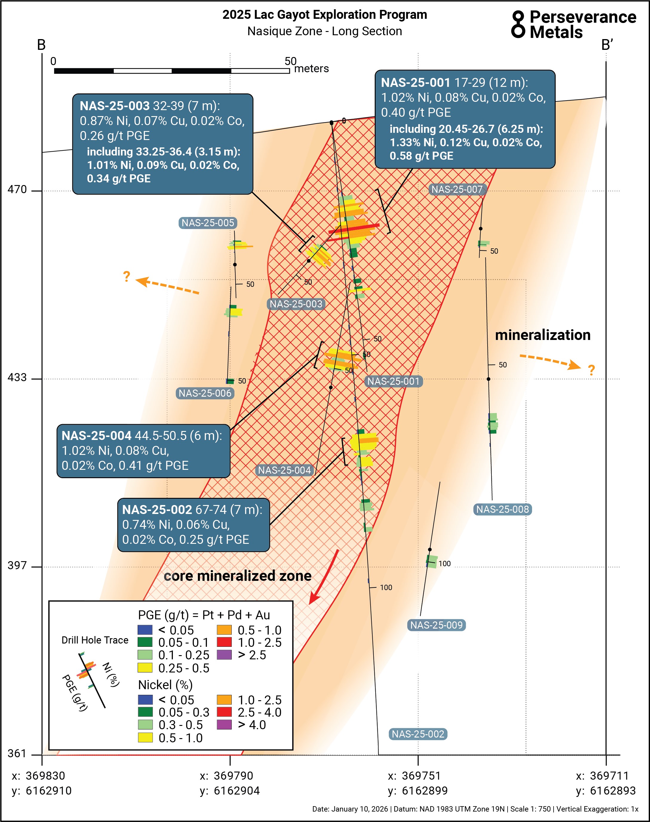 Vancouver, British Columbia--(Newsfile Corp. - January 13, 2026) - Perseverance Metals Inc. (TSXV: PMI) ("Perseverance", "PMI" or the "Company") is pleased to provide assay results from nine diamond drill holes (NAS-25-001 to 009) from the Lac Gayot project, Quebec. These holes were drilled to follow up on the Nasique Zone magmatic Ni-Cu-Co-PGE mineralization first intersected in 2024 (see PMI News Release Sept 19 2024) where discovery drilling intersected 1.61% Ni, 0.11% Cu and 0.48 g/t Pt+Pd+Au over 5.10 metres.