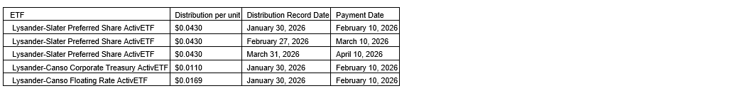 Lysander Funds Ltd. has declared the January, February and March, 2026, cash distributions for each of Lysander-Slater Preferred Share ActivETF, Lysander-Canso Corporate Treasury ActivETF and Lysander-Canso Floating Rate ActivETF. The unitholders of record of each ETF (exchange-traded fund) at the close of business on the distribution record date will receive a cash distribution in the amount indicated in the attached table based on the number of units held, payable on or before the payment date.