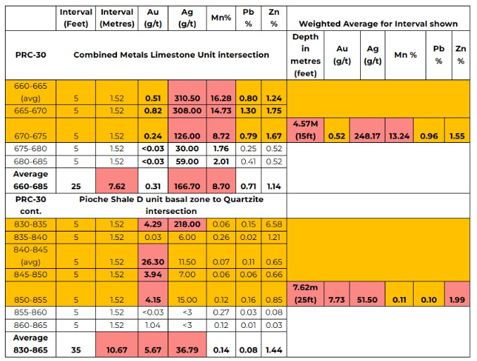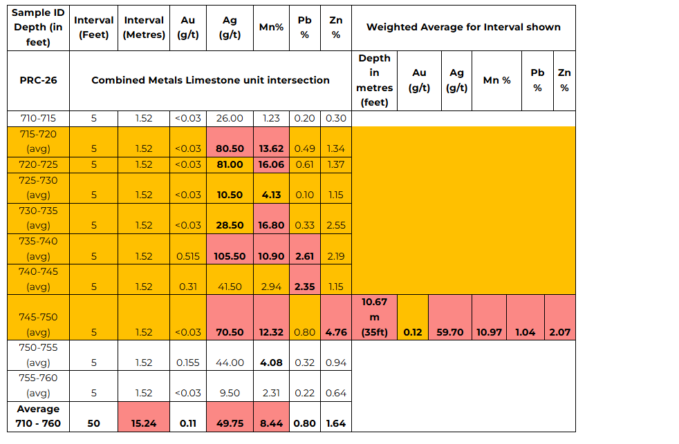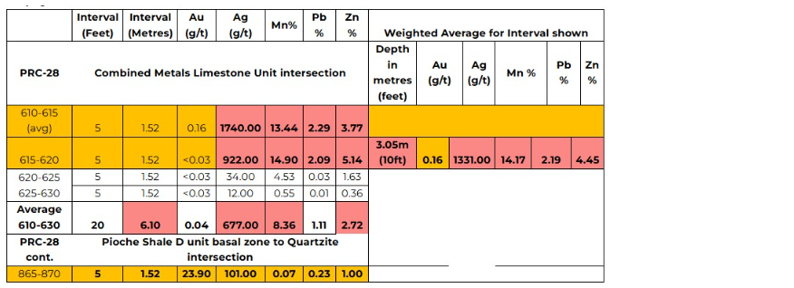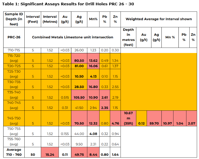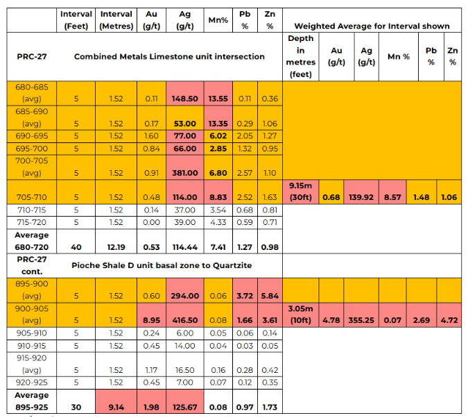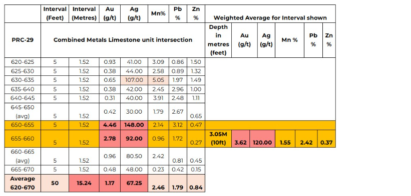 - Including 10 feet (3.05 metres) at 120.00 g/t Ag, 3.62 g/t Au, 1.55 per cent Mn and 2.42 per cent Pb.