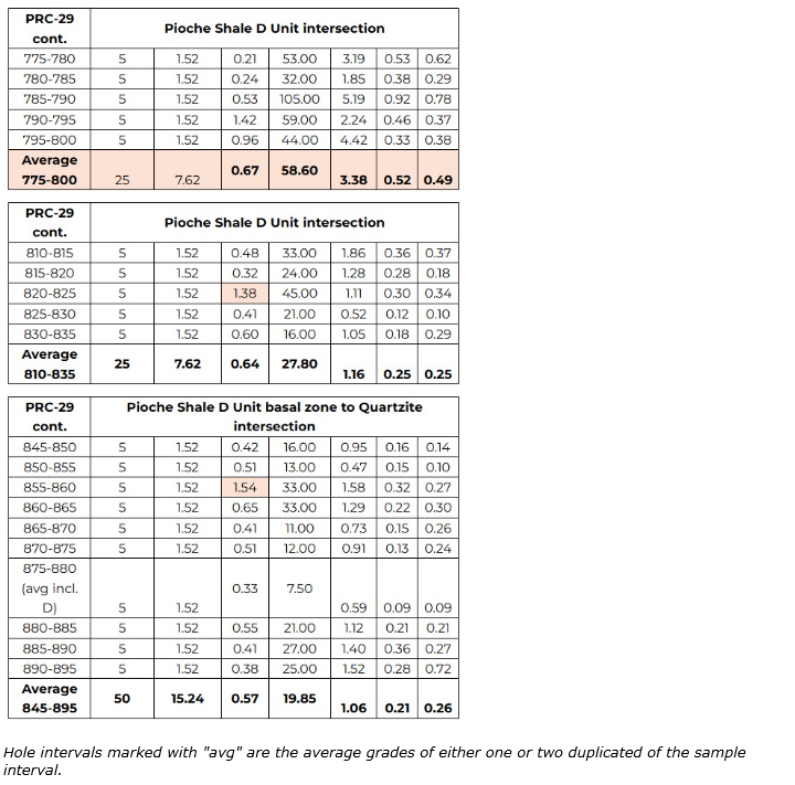The exploration target was based on 129 historical drill holes drilled through mineralized carbonate replacement beds and host Pioche shale up to 300 metres in depth. Mineralized polymetallic intersections based on historical block modelling suggest the immediate exploration target is between 25 million and 43 million tonnes (t) with grades ranging from 1.44 to 1.57 per cent Zn, 0.78 to 0.87 per cent Pb, 0.28 to 0.40 g/t Au, 37 to 40 g/t Ag and 3.62 to 4.30 per cent Mn.