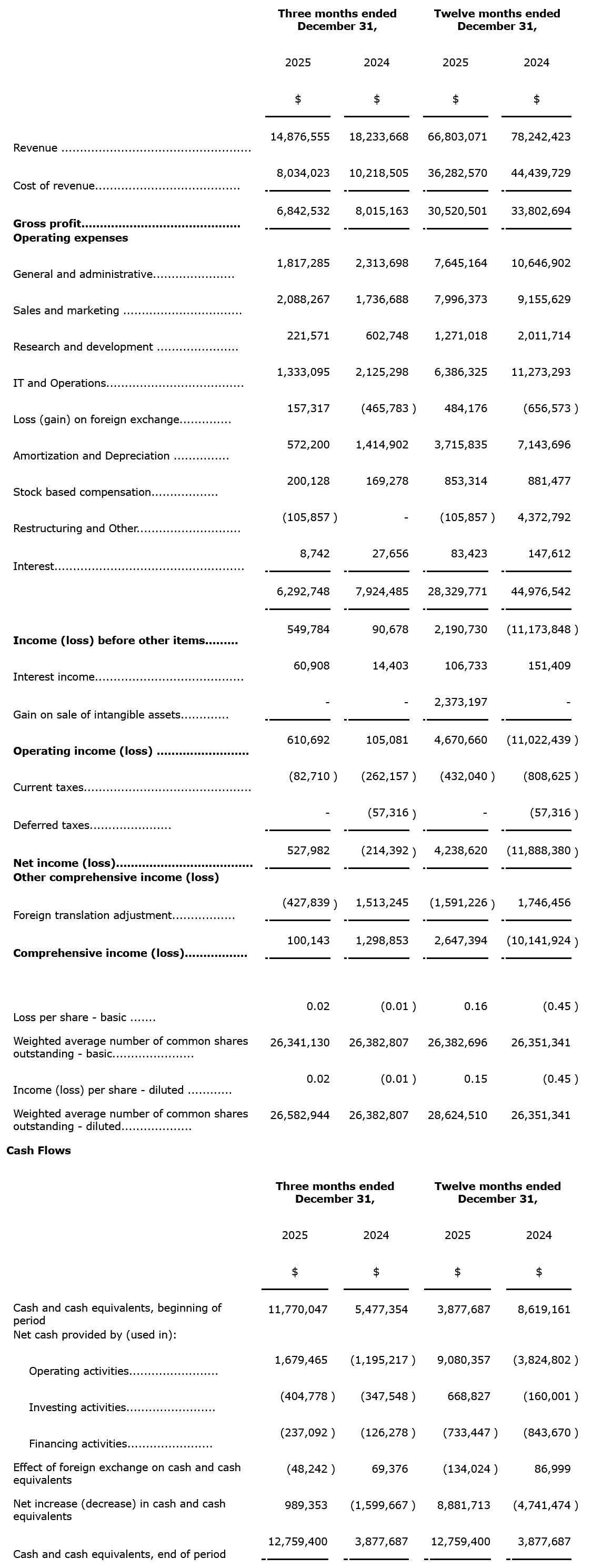 The following table outlines Pivotree's consolidated statements of income (loss) and comprehensive income (loss) for the three and 12 months ended Dec. 31, 2025, and 2024.