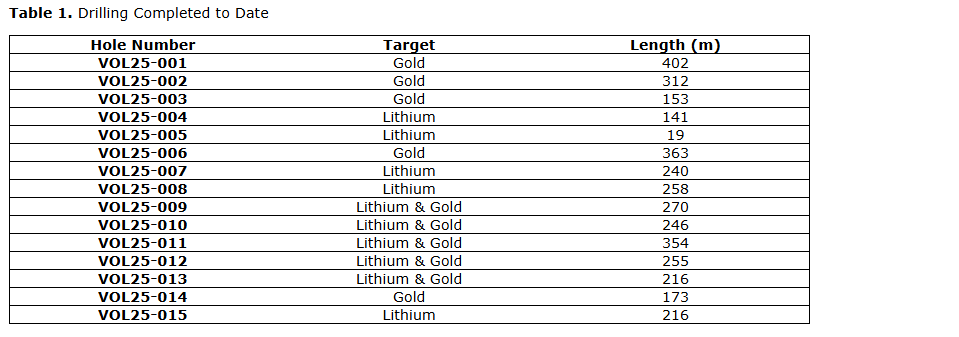 - Phase 1 drilling completed -- 3,600 m across 15 drill holes: The company completed approximately 3,600 metres of diamond drilling in 15 drill holes targeting both interpreted gold-bearing horizons and lithium-bearing pegmatites along the Volney trend, including areas near the historic Giant Volney, Rusty, and Rough & Ready mines. Of the holes completed to date, five have targeted lithium-bearing pegmatites, five have targeted gold-bearing structures, and five have targeted both lithium and gold mineralization (Table 1). This program represents the first modern drill testing along the Volney trend.