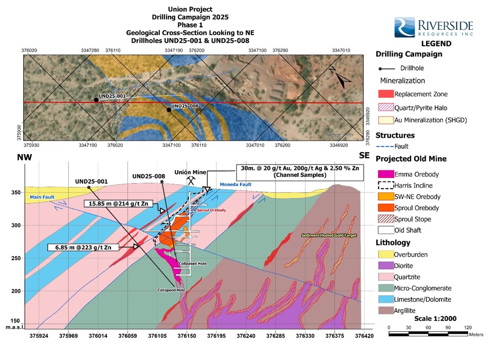 "Riverside is excited by the high grade of 30 meters chip-channel sampling within the oxidized upper part of the Union Mine," said John-Mark Staude, President and CEO of Riverside Resources. "These results, together with the completed Phase 1 drill assays from Union Mine, Union Norte and El Cobre, reinforce that drilling is intersecting the types of CRD-style alteration and multi-element signatures we were targeting, including anomalous zinc, silver, gold and lead consistent with the historic mining district and also finding sediment-hosted gold ("SHGD") indicators is a key development in progressing the Union Project and now we are ready for follow-up drilling in 2026."