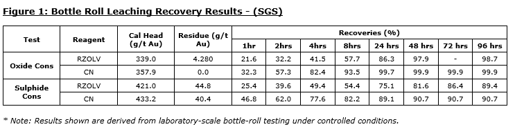 Under the specific laboratory test limits evaluated by SGS, Rzolv achieved gold recoveries of 98.7 per cent on oxide-based gravity concentrates and 89.4 per cent on sulphide-based gravity concentrates over a 96-hour leach retention time. Under the same laboratory conditions, a reference solution containing 2,000 parts per million sodium cyanide achieved gold recoveries of 99.9 per cent and 90.7 per cent, respectively.
