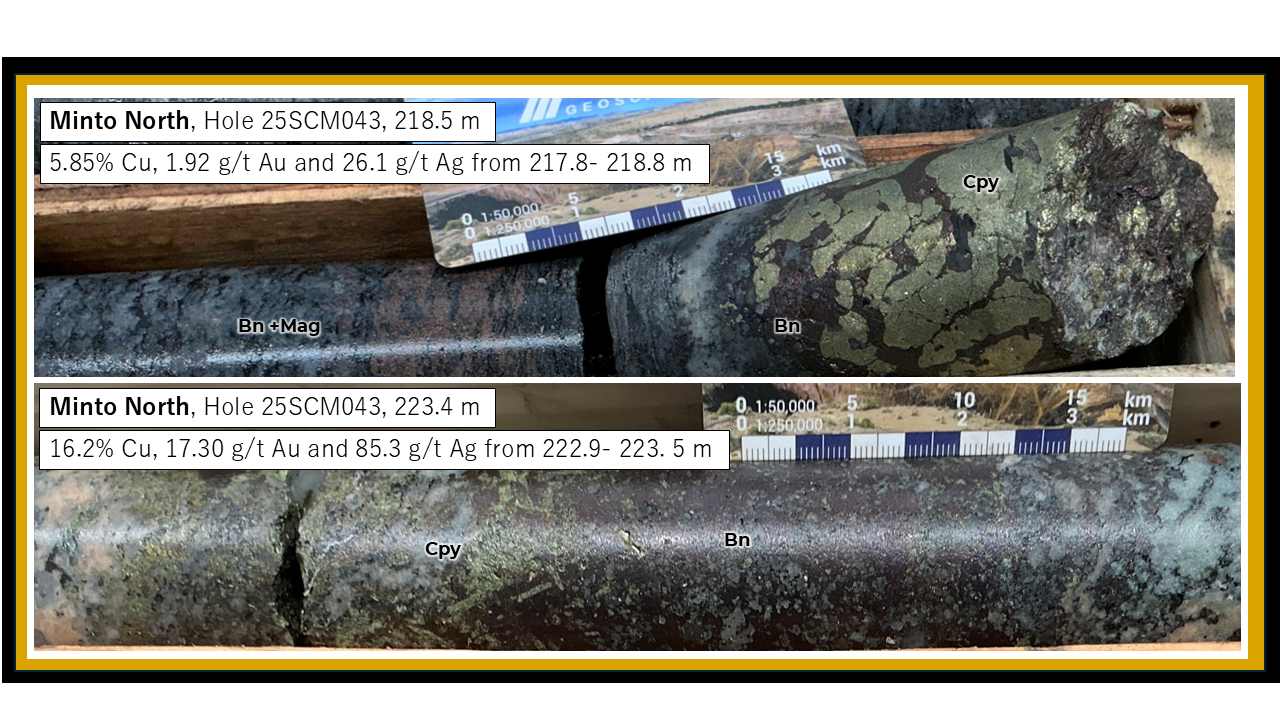 - 3.52% Cu, 3.51 g/t Au and 17.04 g/t Ag over 16.7 m, within a broader zone of 2.09% Cu, 1.84 g/t Au and 9.48 g/t Ag over 32.9 m from 195.9 m in drill hole 25SCM043.