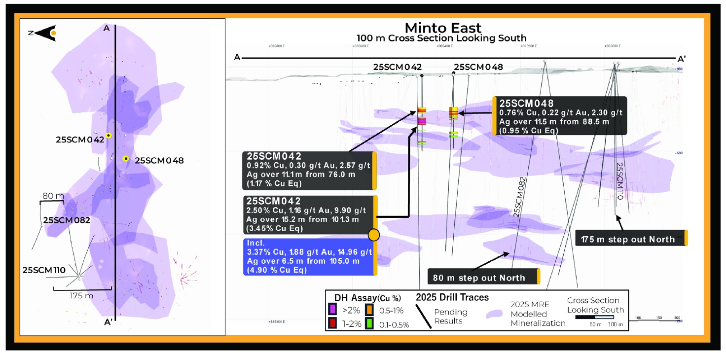 Drill hole 25SCM042 tested an area of inferred resources within the uppermost lenses at Minto East, infilling an approximate 90-metre gap between historical drill holes. Results confirm the continuity of high-grade mineralization through this gap. Mineralization in this lens is characterized by disseminated to folioform chalcopyrite and minor bornite returning 3.37% Cu, 1.88 g/t Au, and 14.96 g/t Ag over 6.5 m, within a broader zone of 2.50% Cu, 1.16 g/t Au and 9.90 g/t Ag over 15.2 m from 101.3 m equating to a copper equivalent of 3.45% (Figure 2).